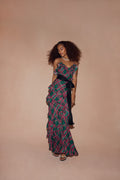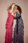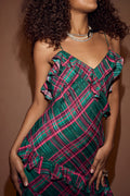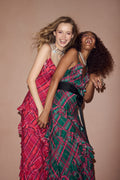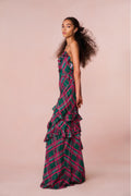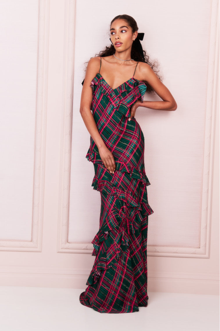 Everyone’s favorite dancing partner, the Rialto Dress, is back and she’s holiday perfection in a festive tartan chiffon fabric featuring gold lamé shimmering throughout. This must-have, party maxi stuns with overlapping, asymmetrical ruffles at the neckline that continue to descend through the entire skirt. Slightly fitted, this dress features a sexy silhouette and includes a side seam zipper for closure.
