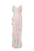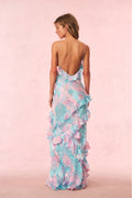 Our best-selling Rialto Dress returns with our beloved burnout viscose drapey fabric for the spring with bright, vibrant colors. This must-have party maxi stuns with overlapping, asymmetrical ruffles at the neckline that continue to descend through the entire skirt. Slightly fitted, this dress features a sexy silhouette.