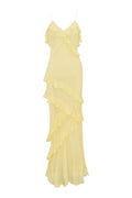 Our best-selling Rialto Dress returns with a silky, drapey fabric for the season with bright, vibrant colors. This must-have party maxi stuns with overlapping, asymmetrical ruffles at the neckline that continue to descend through the entire skirt. Slightly fitted, this dress features a sexy silhouette.