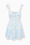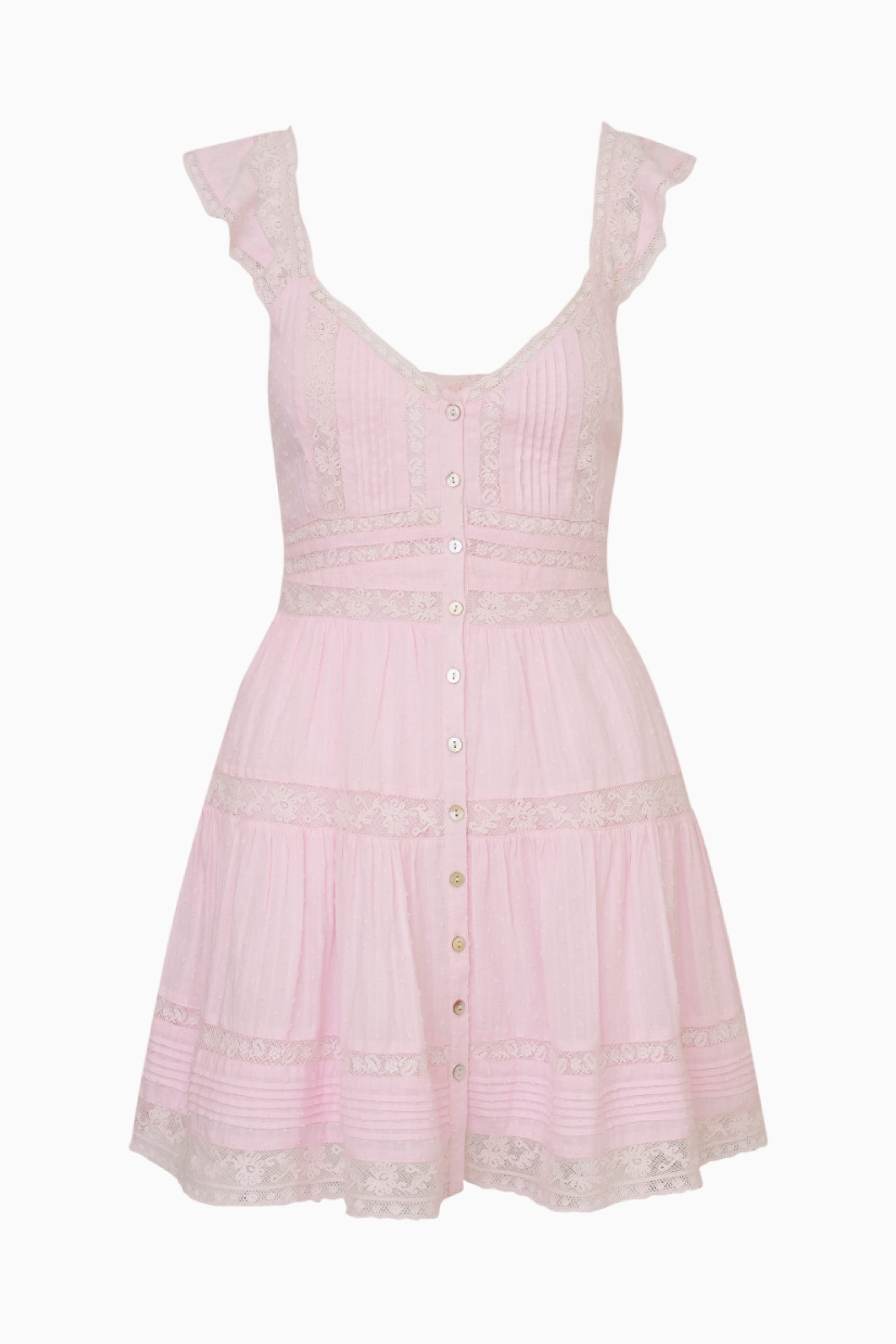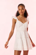 This charming mini debuts with a cotton fabric adorned with vintage-inspired laces and tucking throughout. The piece begins with short flutter sleeves above an open, round neckline that falls to a center front, non-functional placket above a fixed waist yoke. The dress has smocking at the back for an easy and comfortable wear and includes pockets.