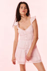 This charming mini debuts with a cotton fabric adorned with vintage-inspired laces and tucking throughout. The piece begins with short flutter sleeves above an open, round neckline that falls to a center front, non-functional placket above a fixed waist yoke. The dress has smocking at the back for an easy and comfortable wear and includes pockets.
