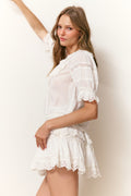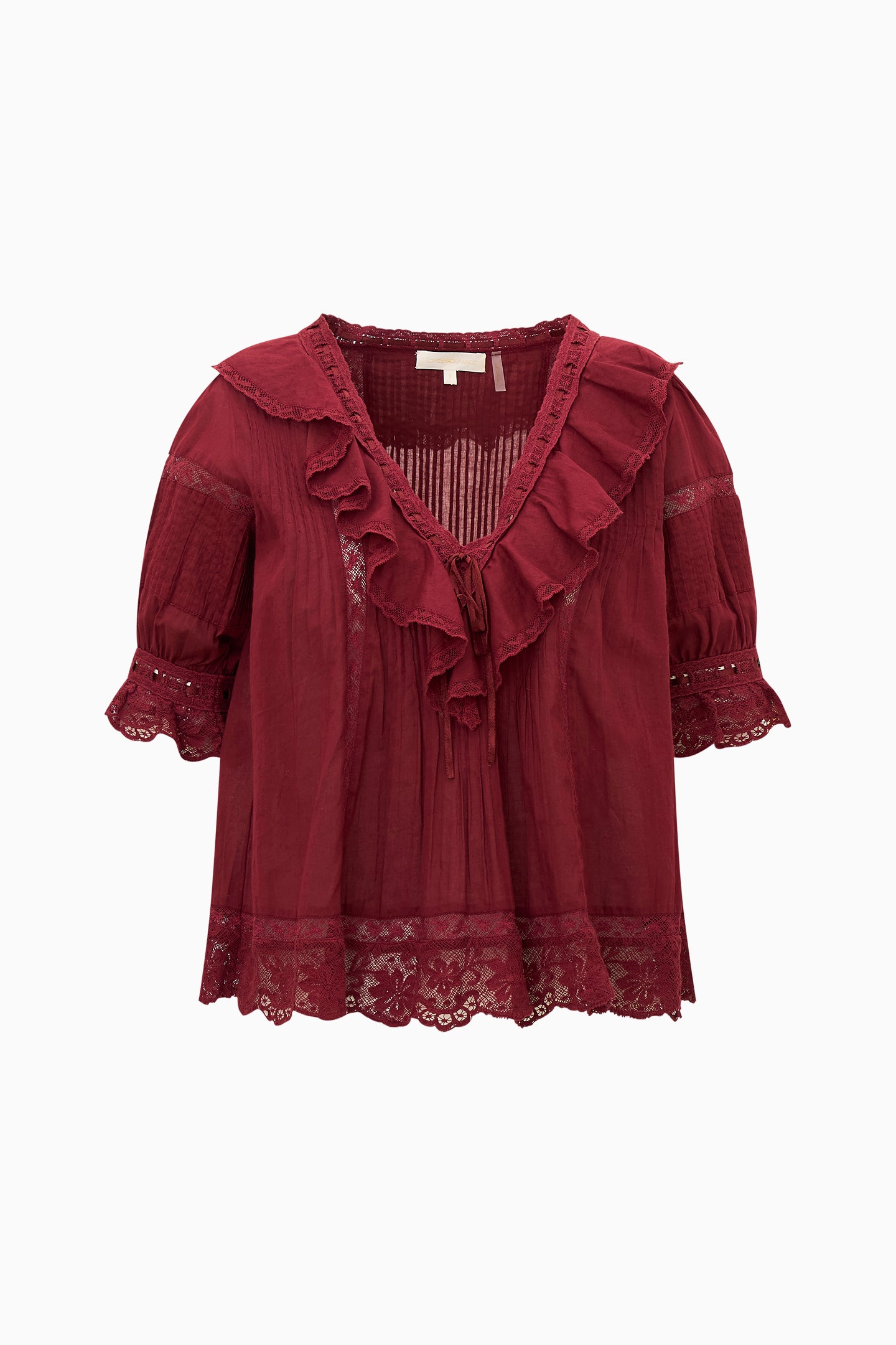 Romance found in the Romilly Blouse. Designed from a cotton voile fabric, this Victorian-inspired top features lace trims and delicate pintucks all over, a threaded ribbon around the v-neckline, and feminine puff sleeves.