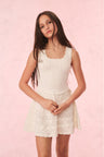Always cute in the Ronellia Dress. Designed from a soft, knit fabric this sunshine mini features tank top straps, a square neckline, and intricate embroideries all over.