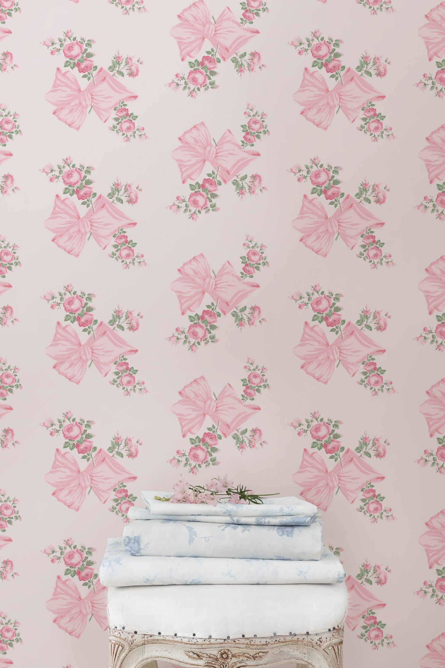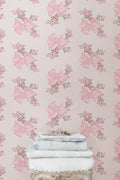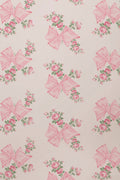 This vintage-inspired design offers both soft femininity and southern charm. Loopy pink bows loosely tie together clusters of pink cabbage roses. Each roll measures 20.5” x 33'.