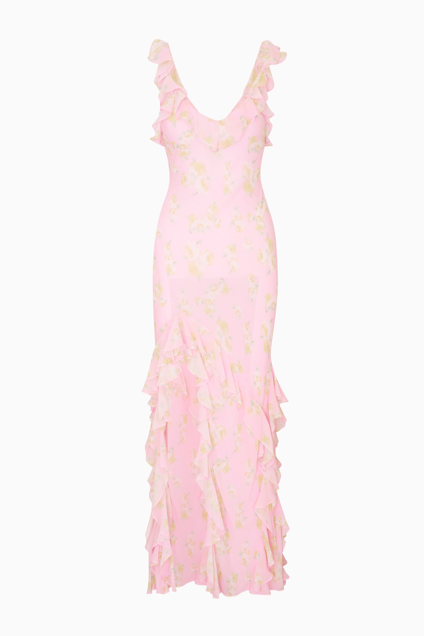 The Roseline Dress captivates with its fitted silhouette adorned with delicate ruffle trim. Cascading chiffon ruffles flow across the hemline for an effortlessly chic finish. Lightweight and sheer, this maxi gown is designed to make every entrance unforgettable.