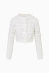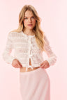 The Roselline Cardigan returns in a lightweight cotton fabric with delicate mixed pointelles all over and a satin ribbon woven throughout. Delicate bows adorn the center front placket lined with grosgrain while hidden snap closures line the inside. Rib trims adorn the neckline and arm cuffs.