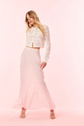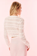 The Roselline Cardigan returns in a lightweight cotton fabric with delicate mixed pointelles all over and a satin ribbon woven throughout. Delicate bows adorn the center front placket lined with grosgrain while hidden snap closures line the inside. Rib trims adorn the neckline and arm cuffs.