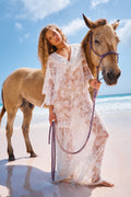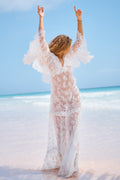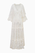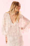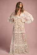 Introducing the Roylan Dress. This full-length, Bohemian-inspired gown stuns with delicate, embroidered flowers dancing amongst a lightweight mesh fabric featuring a gorgeous arrangement of laces throughout. The dress features a plunging V-neckline, two-tiered bell sleeves, and a cape-inspired bodice that ties at the back. The piece includes a separate chiffon slip lining that’s length is shorter than the dress to be worn underneath if desired.