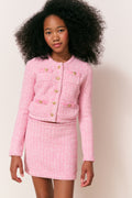 The Rubina Skirt completes the tweed set in the sweetest way. Crafted in a pink-and-white cotton tweed with a hint of lurex shimmer, this A-line silhouette features a comfortable elastic waistband for comfortability. Polished yet playful, Rubina pairs perfectly with the Freydis Cardigan for a coordinated look that feels both charming and timeless.