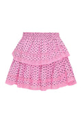 Our best selling Ruffle Mini Skirt returns for the season with a new pretty textured, cotton fabric featuring a clip bow and bow dot woven throughout. She features intricate inset lace trims and allover pintuck details. The elasticated waistband offers flexibility in comfort and styling. Tiered ruffles exude effortless femininity. The mini is finished with a frayed, raw hem for added playfulness. Pair with our Molly Top for a full set.