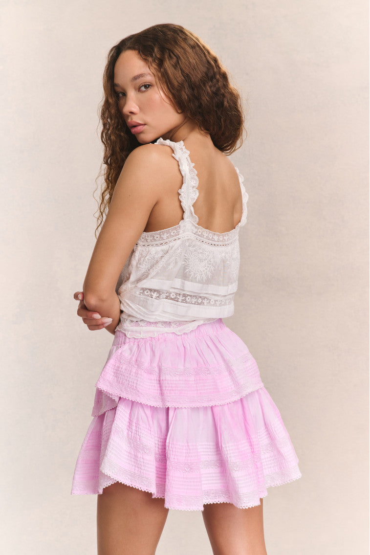Our best selling Ruffle Mini Skirt returns for the season. She features intricate inset lace trims and allover pintuck details. The elasticated waistband and double lining offers flexibility in comfort and styling. Tiered ruffles exude effortless femininity. The mini is finished with a frayed, raw hem for added playfulness. Complete the look with our Nora Top.