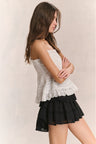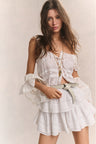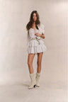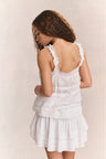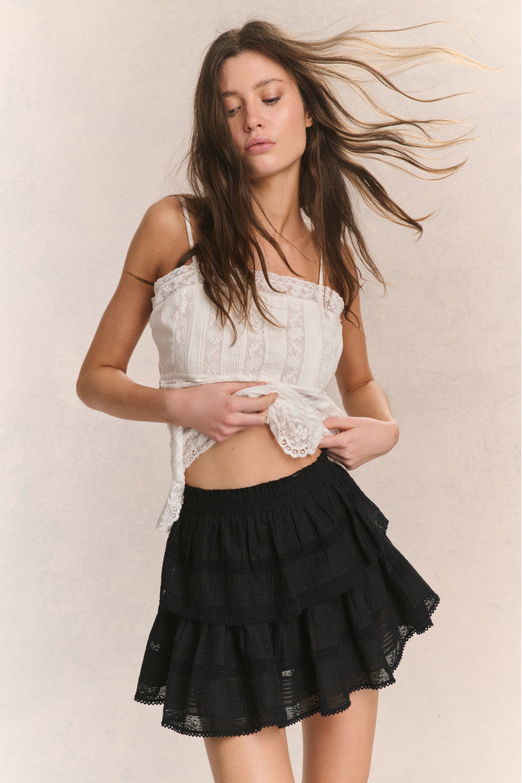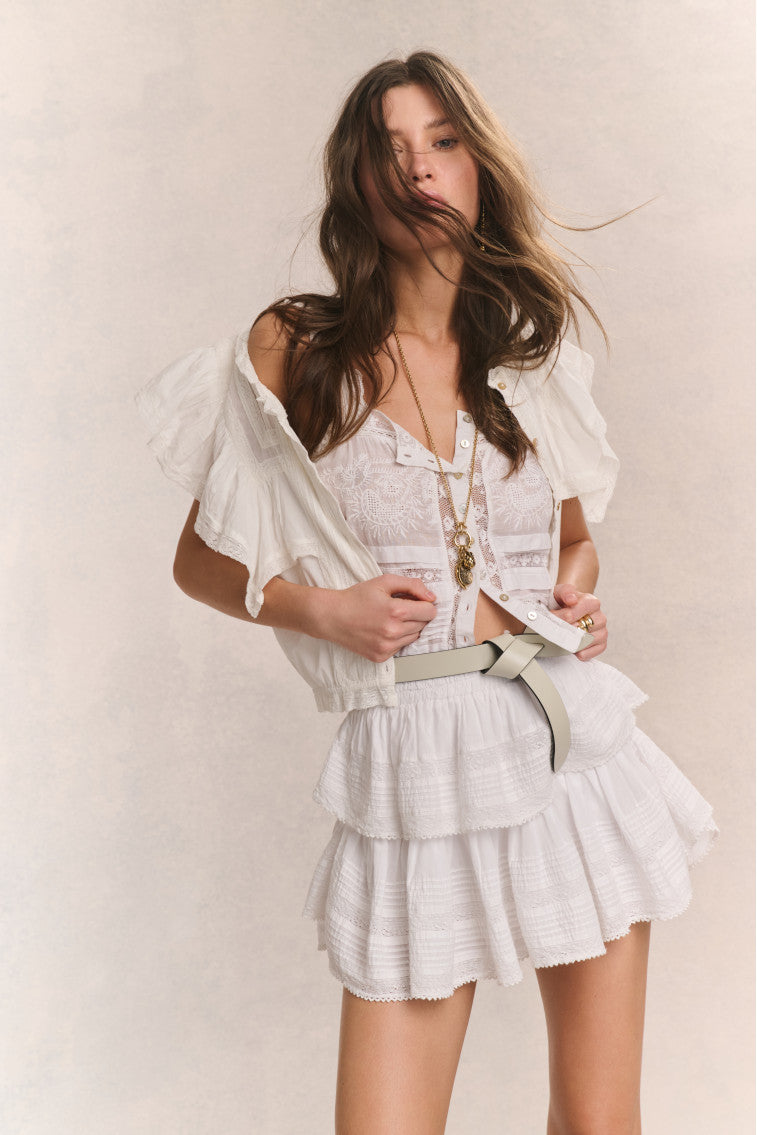 Our best selling Ruffle Mini Skirt returns for the season. She features intricate inset lace trims and allover pintuck details. The elasticated waistband and double lining offers flexibility in comfort and styling. Tiered ruffles exude effortless femininity. The mini is finished with a frayed, raw hem for added playfulness. Complete the look with our Nora Top.