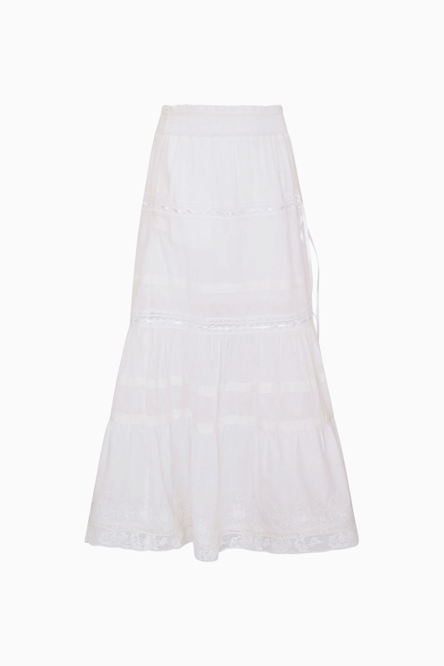 Twirl-worthy and utterly sweet, this dreamy tiered maxi skirt is designed for effortless charm. The lightweight cotton fabric is adorned with embroidered lace and eyelet embroidery finished with a beautiful scalloped edge at the hem. A comfortable elastic waistband makes it as easy to wear as it is pretty.