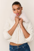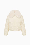 The Sandria Jacket is a cozy, stylish puffer crafted from ivory nylon with LoveShackFancy’s signature heart quilting. Designed with a detachable fur collar, long sleeves, side pockets, and a gold zipper closure, it offers warmth with a feminine, elevated touch.