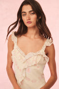 Catching rays in the Serima Dress. This gorgeous sun dress debuts with a mixed printed viscose chiffon fabric featuring a large-scale ikat floral in pretty colors. The mini begins with tank top straps above a slight v-neckline adorned with tiny ruffles. An asymmetrical ruffle lines the bodice before descending to the airy, pleated skirt.