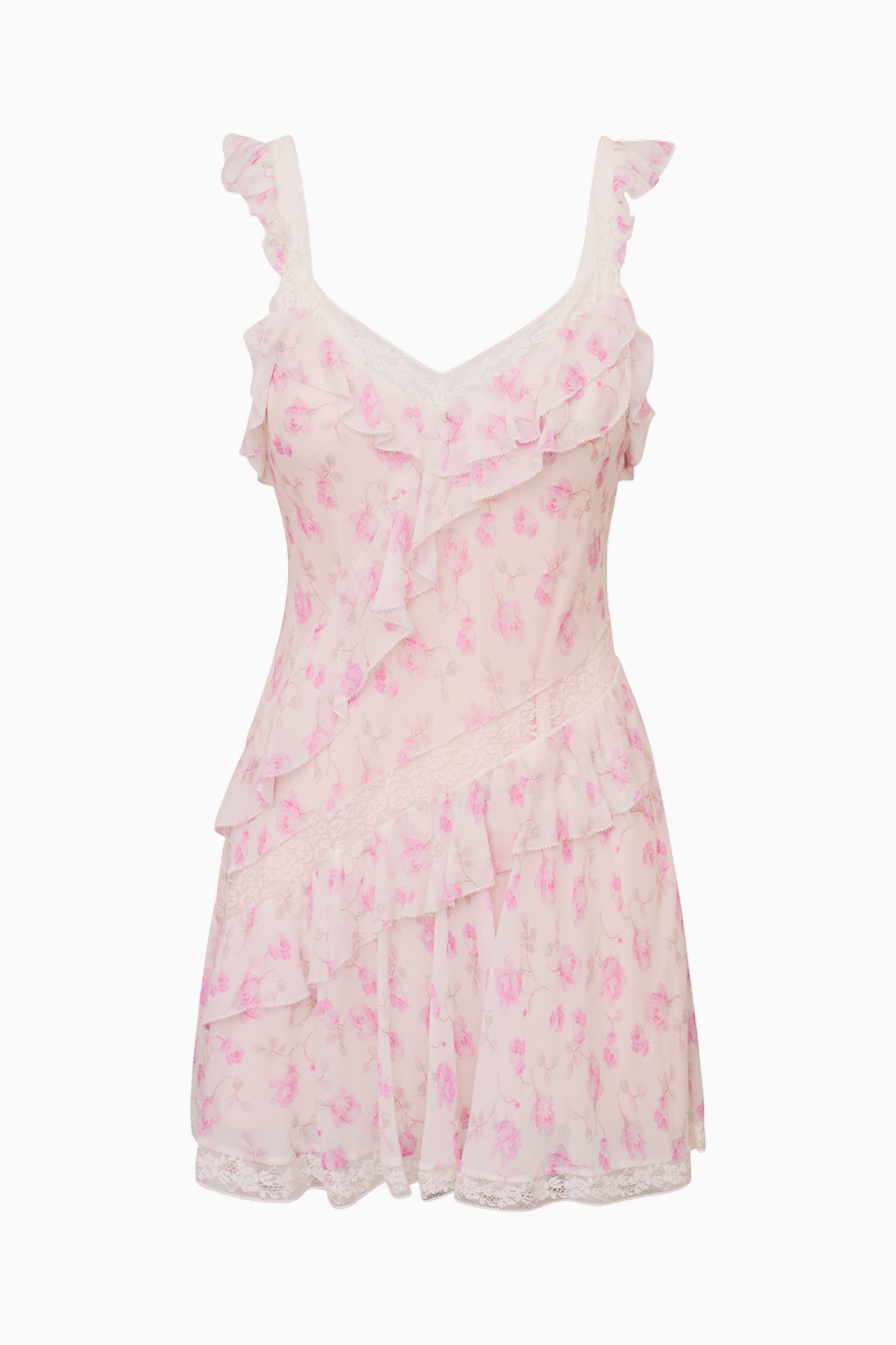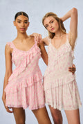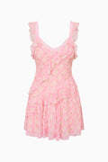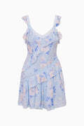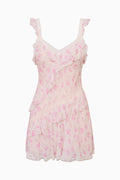 The Serima Dress is back as part of our Fragrance Capsule collection, this time arriving in our best-selling perfume prints.. This gorgeous sun dress is designed with a  printed viscose chiffon fabric. The mini begins with tank top straps above a slight v-neckline adorned with tiny ruffles. An asymmetrical ruffle lines the bodice before descending to the airy, pleated skirt.