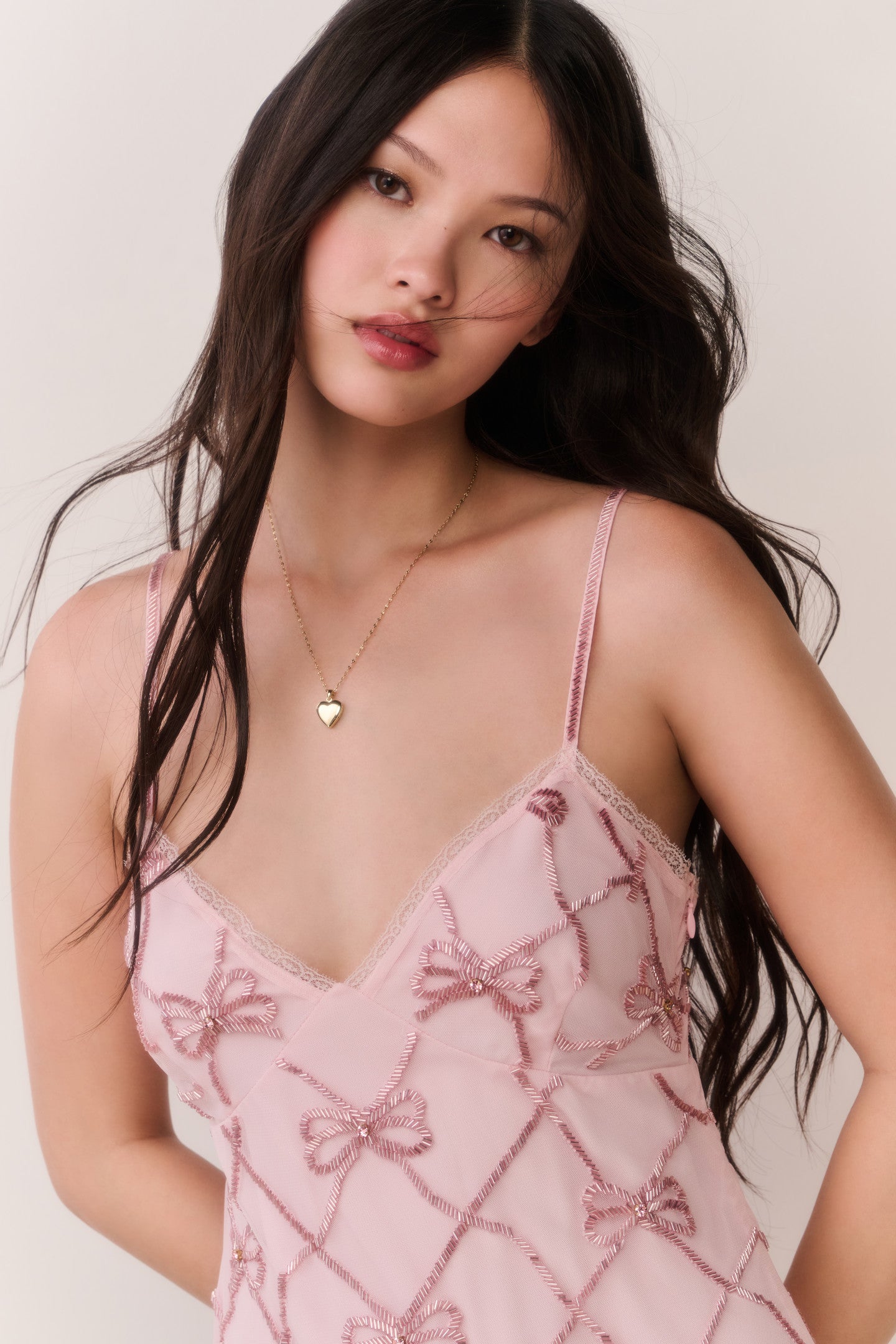 The Shella Dress offers a shimmering take on the classic mini slip, featuring an intricate Sweetheart beaded overlay in a soft pink. A delicate V-neckline and slender spaghetti straps frame the silhouette, creating a look that is both playful and romantic.