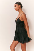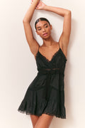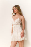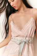 Sweet as ever in the Sibelle Dress. This romantic mini is designed from a luxe, silk habotai fabric. The dreamy dress arrives with a bow-wrapped bodice made from threaded grosgrain ribbon, wide lace at the waist that falls to a flirty skirt with laces and pintucks, and delicate spaghetti straps. The piece is lined with polly georgette.