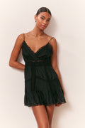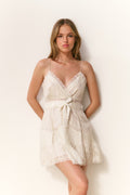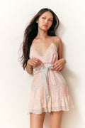 Sweet as ever in the Sibelle Dress. This romantic mini is designed from a luxe, silk habotai fabric. The dreamy dress arrives with a bow-wrapped bodice made from threaded grosgrain ribbon, wide lace at the waist that falls to a flirty skirt with laces and pintucks, and delicate spaghetti straps. The piece is lined with polly georgette.
