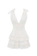 Introducing the Soira Dress. This charming mini is designed with a crisp cotton poplin fabric with stunning details like Victorian-inspired laces with heart eyelets all over. Beginning with a deep v-neck with a self-tie detail the dress descends to a smocked waist. A sweet heart trim lines the neck while eyelet hearts adorn the two-tiered skirt.