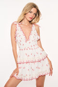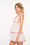 The Soira Dress returns as part of our America’s Sweetheart Cotton Collection. This charming mini is designed with custom developed scalloped trim featuring embroidered dancing cherries all over. Beginning with a deep v-neck with a self-tie detail the dress descends to a smocked waist. A sweetheart trim lines the neck while eyelet hearts adorn the two-tiered skirt.