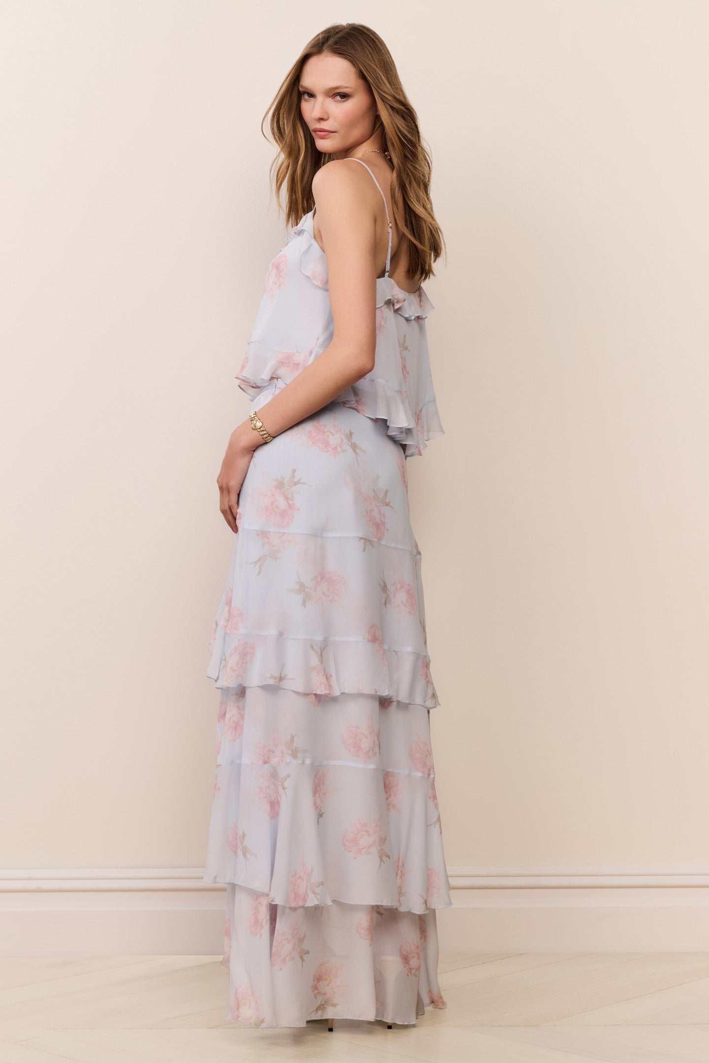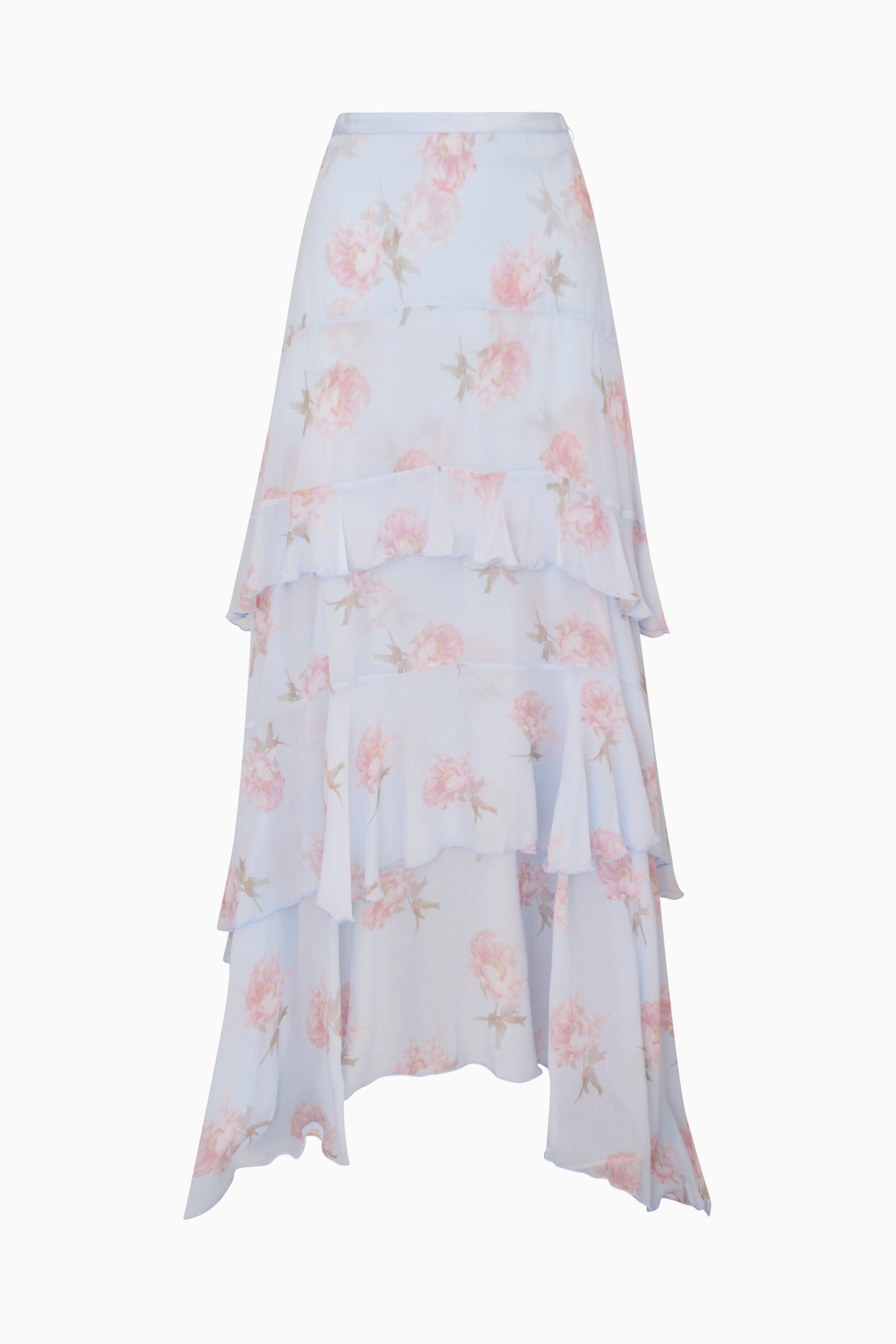 The Soleia Skirt is an easy, flowy chiffon skirt with a soft tiered silhouette. Cascading ruffles, a high-low hem, and an all-over floral print adds a pretty, feminine touch. Designed to drape loosely from a fixed waist, this lightweight, unlined skirt feels breezy and feminine.