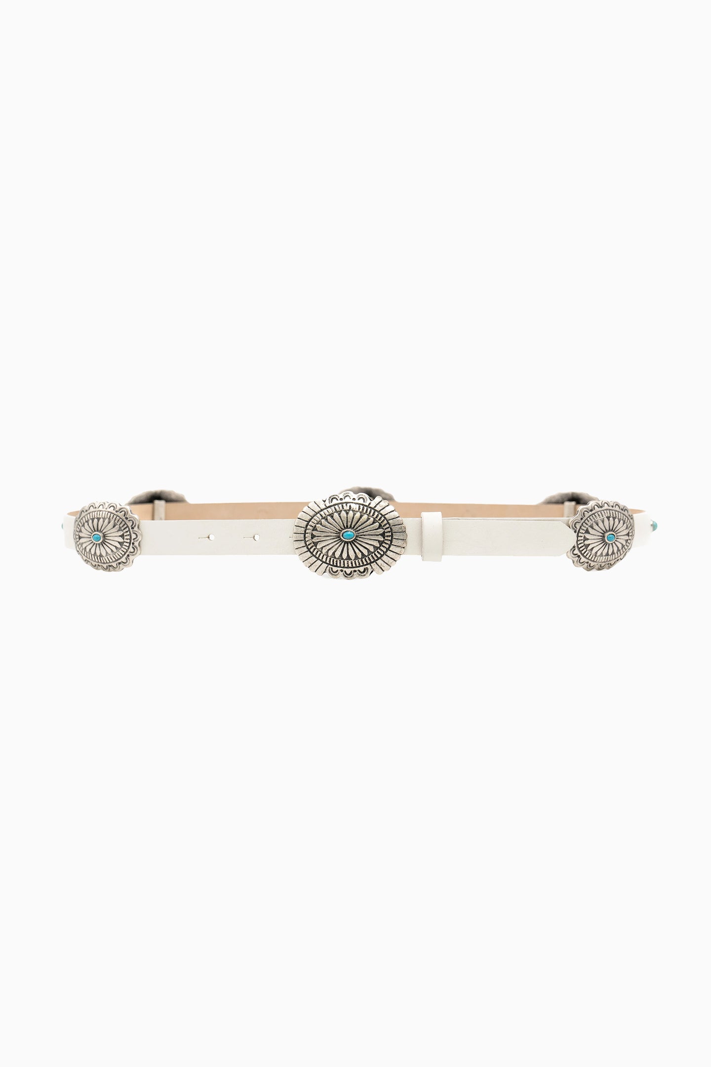 Add a touch of the Wild West to your outfit with the Iris Concho Belt. Expertly designed in white or distressed bone leather, this belt features beautiful old silver and turquoise conchos, as well as western-inspired hardware. Upgrade your style and embrace the western trend with this unique addition to your wardrobe.