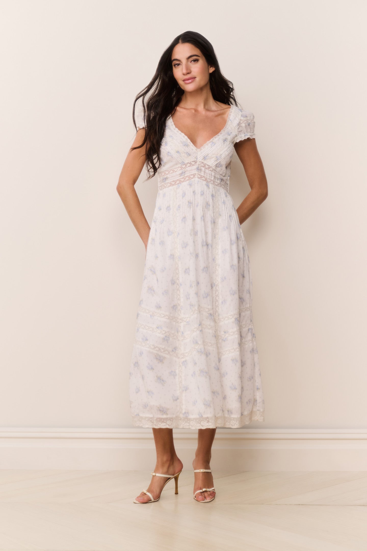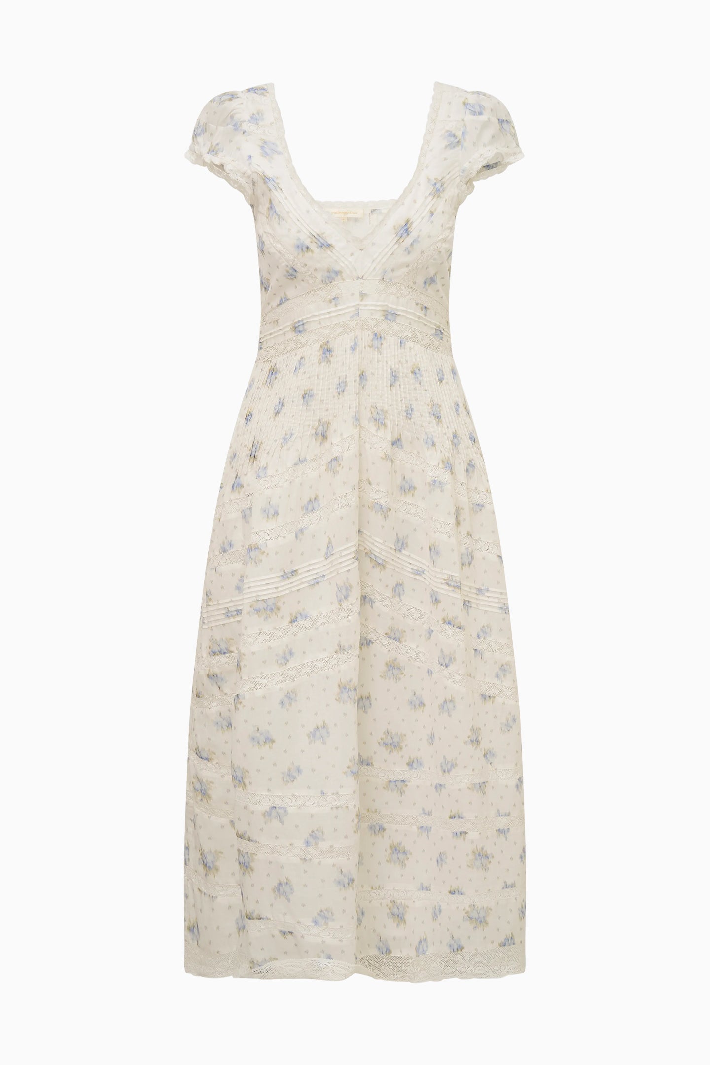Introducing the Suvi Dress. This Victorian-inspired midi dress stuns with an airy cotton fabric printed with our new, playful confetti bloom print and features vintage-inspired laces all over. The dress begins with short cap sleeves above a v neckline that falls to an empire waist which releases into a sweepy, a-line skirt. There is tucking at the waist giving this piece a feminine silhouette. There’s smocking at the back for ease and comfort and includes pockets.