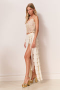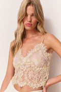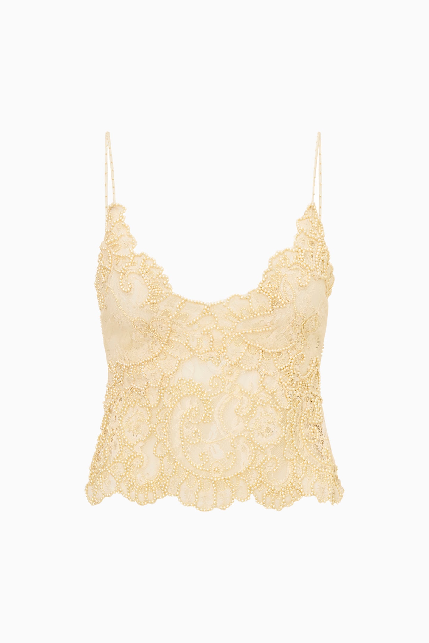 A true jewel of the collection, our Svetlana Top stuns in ornate Chantilly lace encrusted with delicate, artisanal pearls that trace every scalloped edge. This peplum cami hugs the waist before flaring softly at the high hip, balancing structure with romance. A deep open neckline and sheer finish below the lined bodice add just the right amount of femininity, while pearl-applied straps—adjustable with a dainty back loop—complete the dreamy, fashion-forward silhouette. Equal parts ethereal and statement-making, Svetlana is the definition of heirloom artistry.