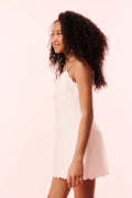 Our minis are sweet in the Sydelia Dress. This charming linen dress features thin spaghetti straps, scallop detailing and a self-tie bow detail at center front.
