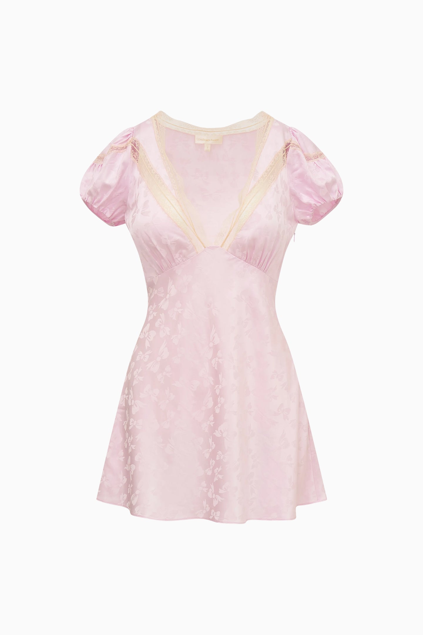 Designed in our custom satin jacquard, the Sylara Dress is a flirty, bias-cut mini with an empire waist and soft shirring at the bust. Lace striping traces the neckline and puff sleeves, which feature elastic at the openings for a perfect fit. Finished with a hidden back zipper for effortless wear.