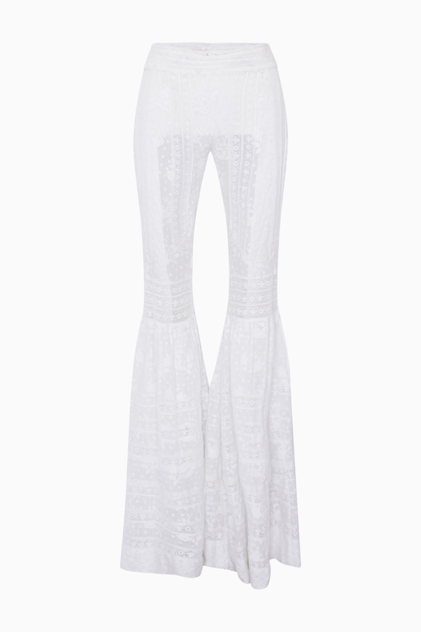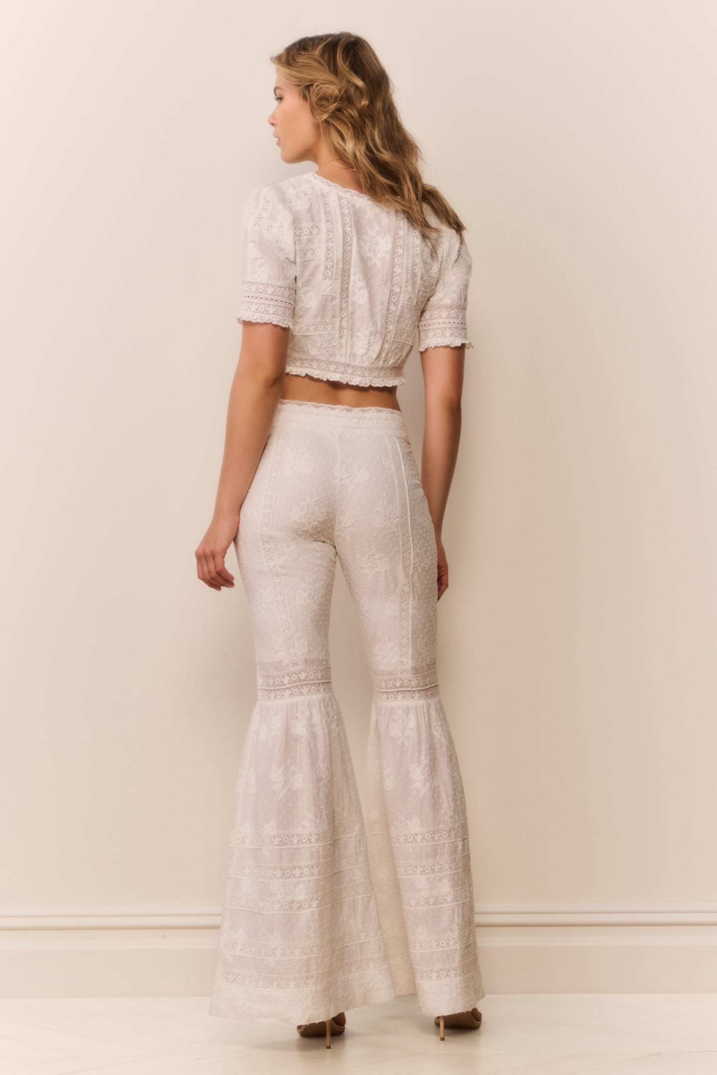 Crafted from airy cotton and floral eyelet lace, the Telva Bell Bottom Pant offers a slim fit through the hip that transitions into a dramatic flared leg. A low-rise waist and flat-front design provide a streamlined look, while the lightweight construction ensures a gentle flow with every step.