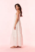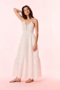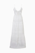Feeling feminine in the Terria Dress. This evening time maxi dress debuts with a summertime cotton fabric ideal for warm weather and vacation wear, adorned with gorgeous scallop embroidery, vintage-inspired laces, and tucking details. The piece stuns with thin spaghetti straps above an open neckline that falls to a fitted waist yoke that descends to a sweeping skirt with a beautiful arrangement of laces and tucks at the skirt followed by the scallop embroidery at the hem.