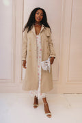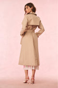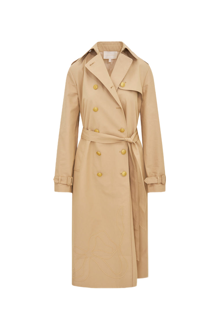 Introducing the Thiel Trench Coat. Our take on a classic, cozy trench coat, this luxe outerwear layer debuts with a midi length and an elevated fabric. Featuring military buttons, the jacket has storm flaps at the chest and back and epaulettes at the shoulder. Giving this piece the LoveShackFancy touch, a giant winding bow applique adorns the hem for a feminine moment. The double-breasted, functional jacket is finished with side seam pockets and a removable belt.