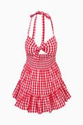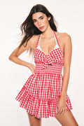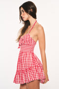 Introducing the Trishelle Dress arriving as part of our America’s Sweetheart Cotton Collection. This midsummer mini stuns with an all-American classic gingham print all over. The piece begins with a self-tie halter neckline above the bust which also features a tie detail above a flirty cut out. Below the bust is a smocked waistband that releases into an ever-flowing skirt that hikes up slightly on the side giving this mini a feminine and playful silhouette.