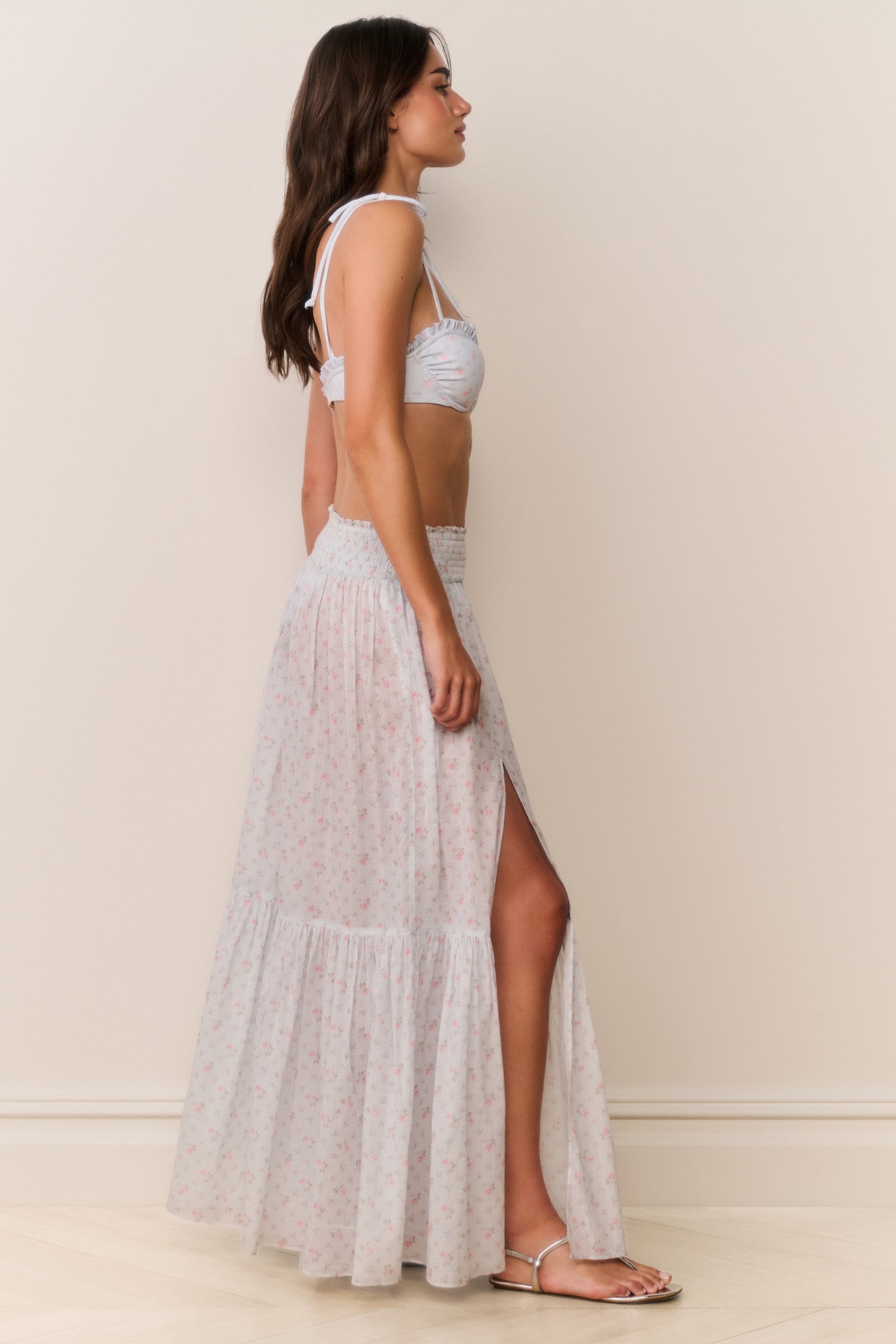 The Umber Skirt flows effortlessly in a tiered maxi silhouette designed to move with ease. A wide smocked waistband provides gentle structure, while sheer floral tiers create airy dimension. Crafted from lightweight cotton with a ditsy floral print, this piece feels both romantic and relaxed. A thigh-high slit adds graceful movement to every step.