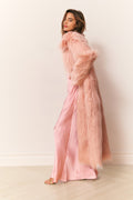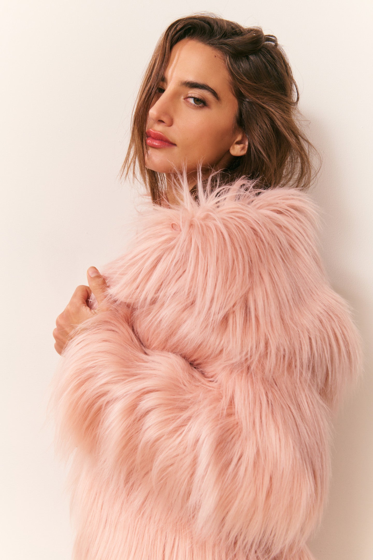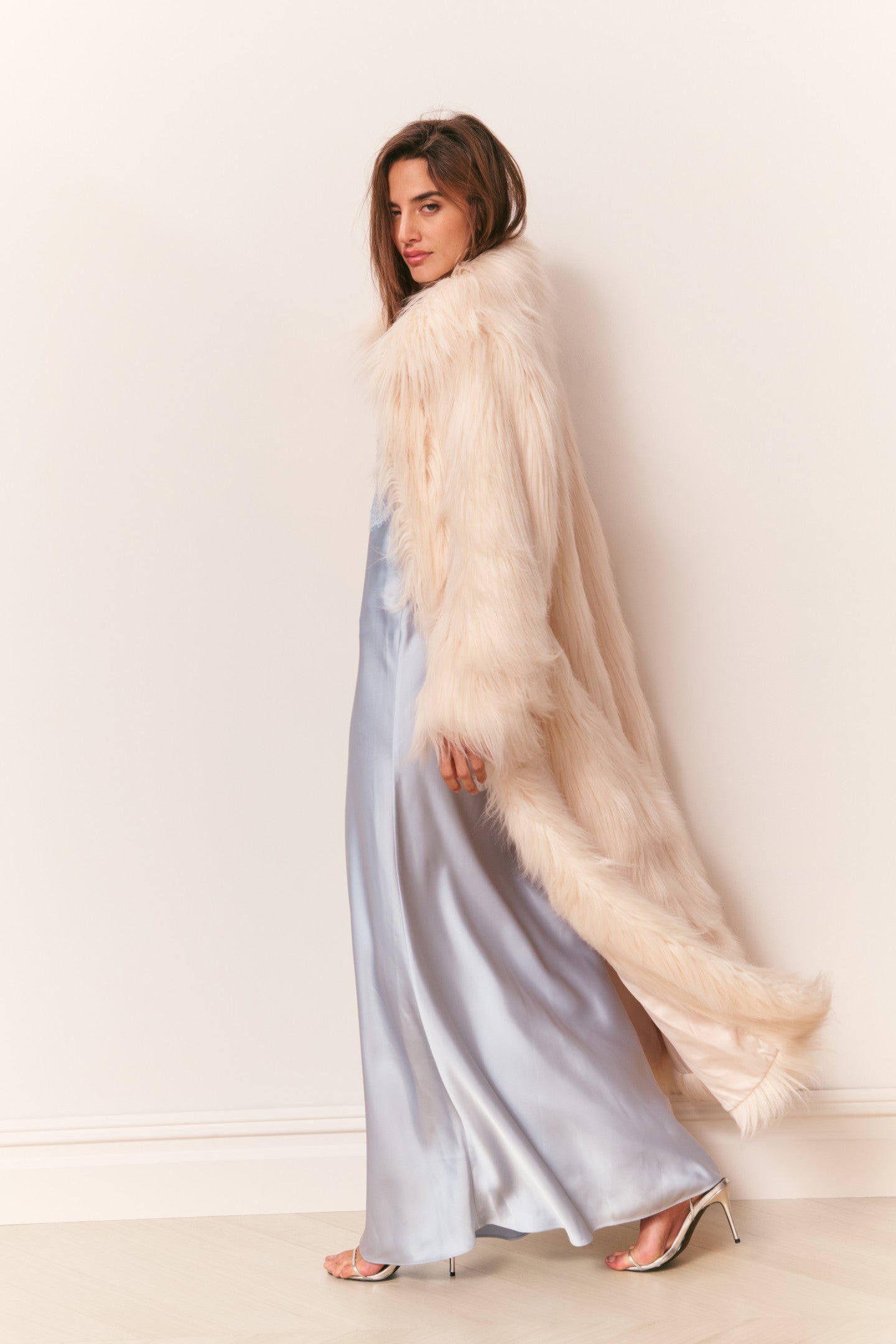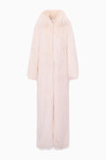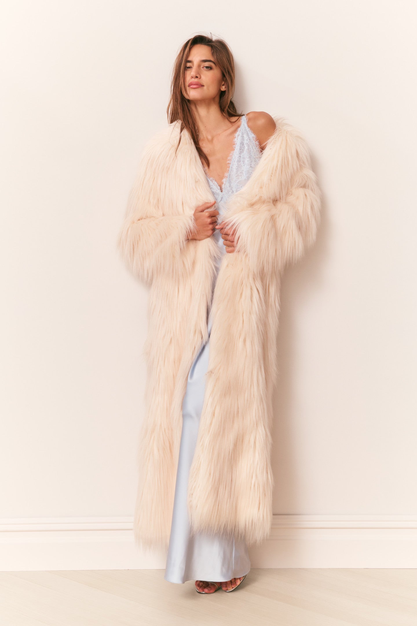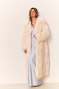 The Valia Coat is a floor-length faux shearling duster. Crafted from a plush underbrush faux shearling, it features a dramatic, oversized silhouette with long, roomy sleeves and a generous collar. Fur hook-and-eye closures and side pockets add functional detail, making it perfect for layering over everything from evening dresses to cozy knits. A statement piece for chilly days, the Valia coat is a must.