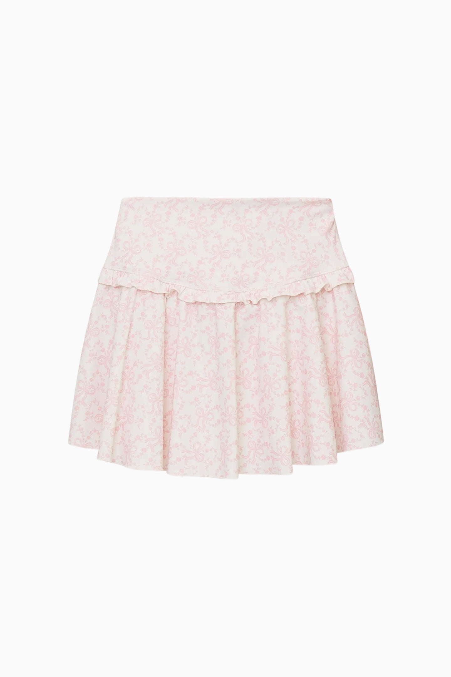 Feeling fit and flirty in the Vanina Skort. Fun and functional, this skort arrives with our signature bow print. A must-have essential, the easy skort features a high waistband, ruffle tiers at the yoke edges and built-in shorts. The interior short lining is designed with a breathable and lightweight mesh fabric. Ideal for any high or low impact workout from running to hiking to pilates and everything in between, this skort is designed to do it all. Pair with the Erza Bra for a full set.