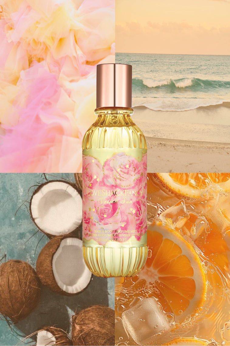A slim, fluted mist that adds a fanciful edge to your everyday spray. This one is all about the watercolor florals, tropical fruits, and gold stars and hearts. The Blurred Rose print is a signature design chosen from over 2,000 in the LoveShackFancy print and lace library to decorate this sun-colored bottle, which is topped with a matching metallic cap.