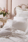 Our best-selling Lumbar Pillow returns, this time channeling our vintage-inspired romance with Victorian-inspired details like lace, embroideries, and elevated textures. The large, oversized pillow arrives in a crisp, white color. This pillow dresses up your bedding with a double layer self and ruffle-adorned edges.