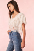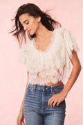Introducing the Vienne Top. This stunning piece features sheer, lace chiffon all over giving this top a Bohemian-inspired look. With ruffles and layers abound, the top has short sleeves, an open scoop neck, and hits just below the natural waist.