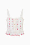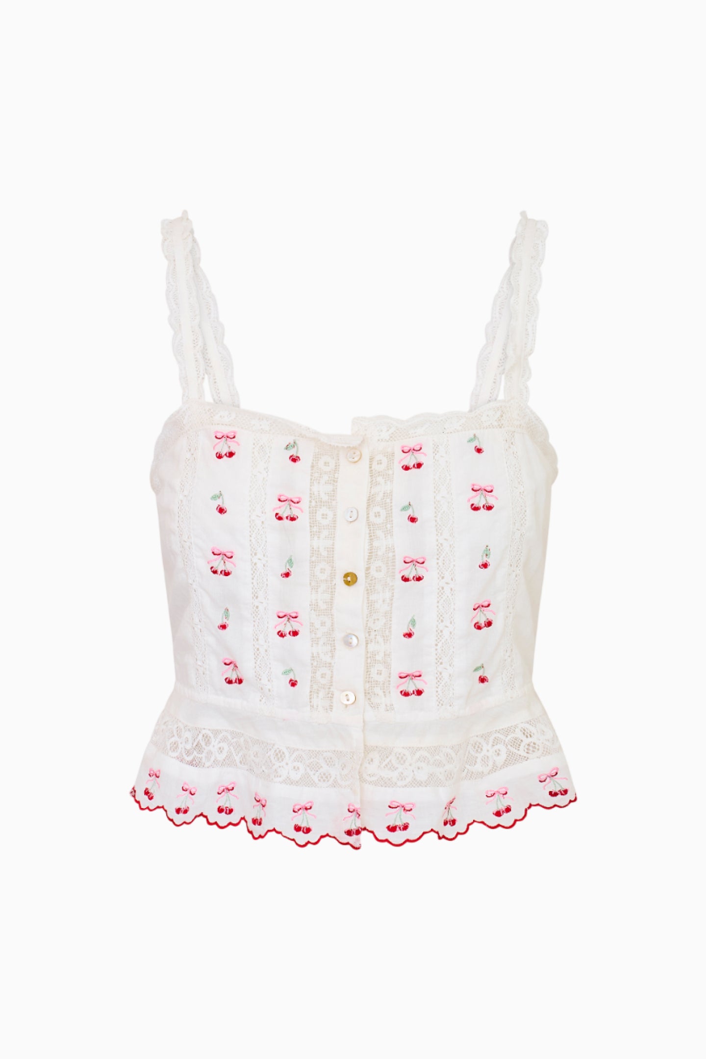 The Vietta Top returns as part of our America’s Sweetheart Cotton Collection. This charming top debuts with dancing cherry embroideries all over and a custom developed scallop hem detail. This fitted, Victorian-inspired cami top comes cropped with a center front placket designed with intricate laces all over and floral embroidery detail. The piece features thin straps, a square neckline, buttons down center front, and a flirty peplum  hem.