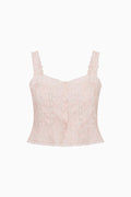 In celebration of our new fragrance, Secret Crush, our Vietta Top returns as part of our new Secret Crush capsule collection. This charming top is reimagined with our new signature bow print all over and a custom developed scallop hem detail. This fitted, Victorian-inspired cami top comes cropped with a center front placket designed with intricate laces all over and floral embroidery detail. The piece features thin straps, a square neckline, buttons down center front, and a flirty peplum hem.