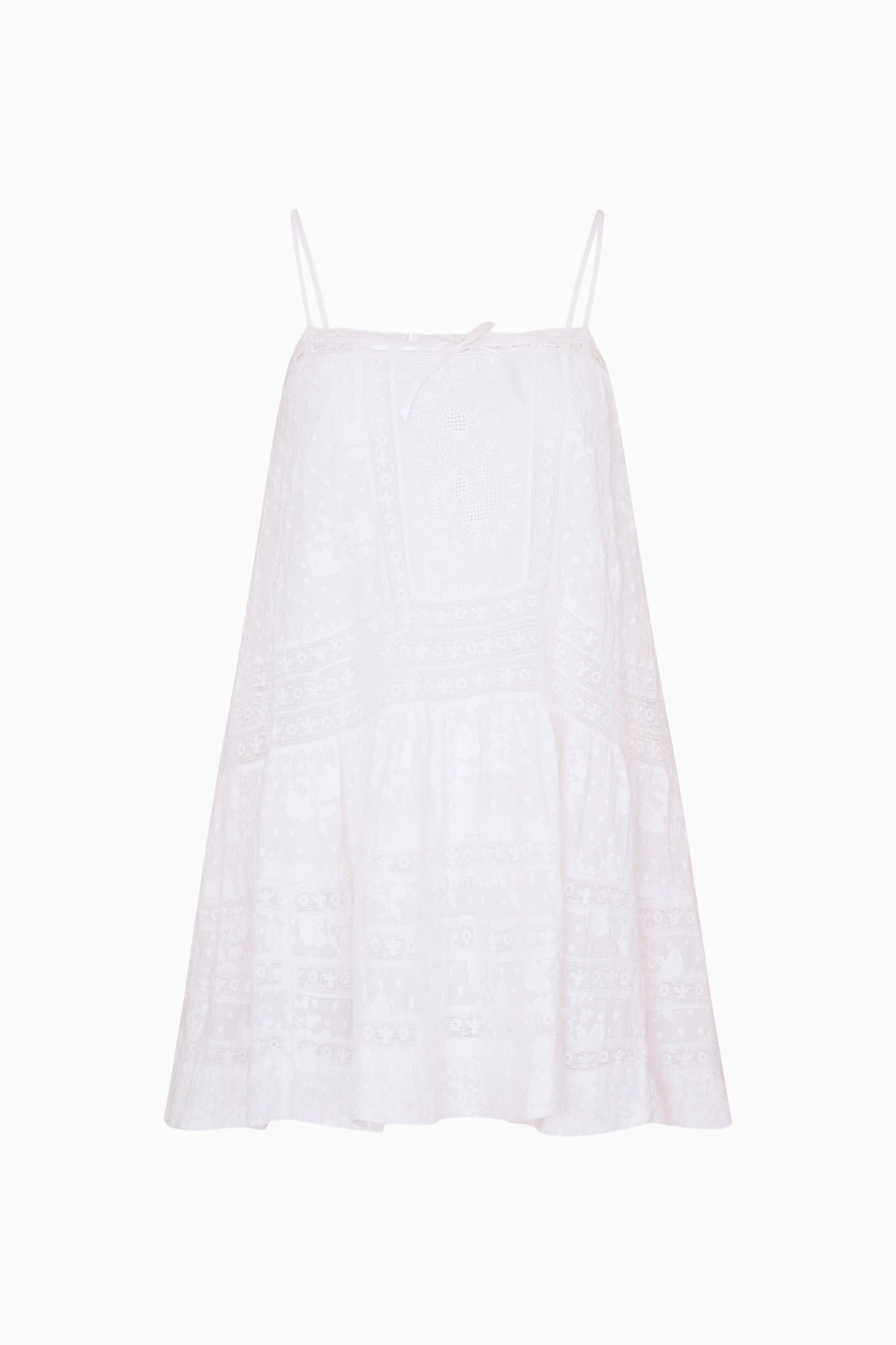 The Vionett Dress features a breezy trapeze silhouette in a lightweight floral-embroidered fabric. This sleeveless mini is detailed with a front bow at the neckline, while delicate lace accents add a whimsical, effortless touch.