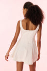 Pretty and playful in the Vionne Dress. Designed from a twill denim stretch cotton fabric, the feminine mini features intricate bow and heart embroideries all over complete with iridescent pearls. With a fit-to-flare silhouette, the dress begins with a scoop neckline that falls to a sweepy A-line skirt.