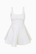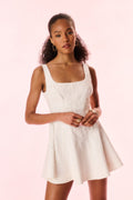 Pretty and playful in the Vionne Dress. Designed from a twill denim stretch cotton fabric, the feminine mini features intricate bow and heart embroideries all over complete with iridescent pearls. With a fit-to-flare silhouette, the dress begins with a scoop neckline that falls to a sweepy A-line skirt.