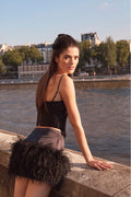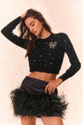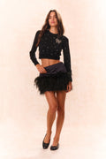 On our way in the Viviette Skirt. This flirty, party mini is crafted from a sophisticated satin fabric. The skirt stuns with a full bloom effect featuring an abundance of feathers. This sexy piece is finished with a zipper for functionality.