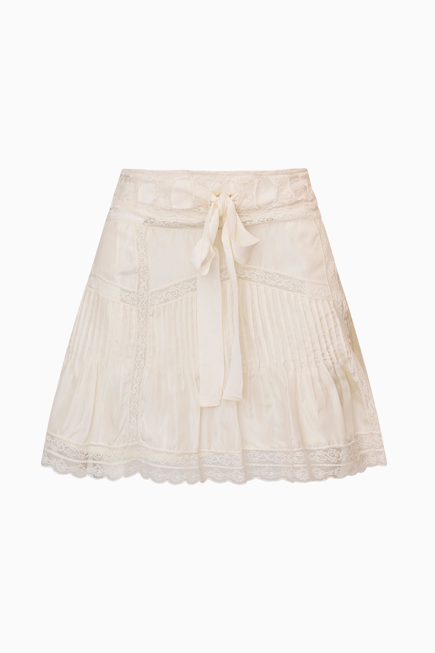 Obsessed with the Willia Skirt. Feminine and flirty, the charming mini is designed from a luxe, silk habotai fabric. The A-line skirt stuns with pintucking details and laces all over and a threaded wide grosgrain ribbon at the waist. The piece is finished with a zipper.