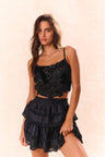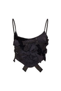 Introducing the Woodley Top. This playful, satin bustier top is a dream come true with a medley of bows designed from mixed fabrics hand-appliqued and placed in a beautiful arrangement showcasing a stunning blend of textures and tonal colors – from sequins to tulle, charmeuse, organza, and velvet. The feminine piece has a flattering silhouette due to boning, spaghetti straps, and is finished with a zipper on the back.