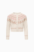 Introducing the Wrenna Cardigan. This charming cardi swoons a warm, soft fabric featuring a whimsical fair isle pattern with hearts and festive motifs throughout. The piece is finished with buttons down center front.